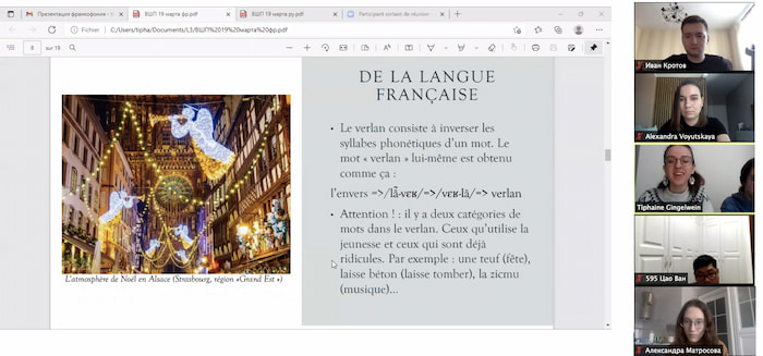 19 марта в Высшей школе перевода в рамках празднования Международного дня франкофонии прошла встреча российских и иностранных студентов со студентками Института восточных языков и культур (INALCO, Париж) Жюли Бонин и Тифен Гингельвейн.