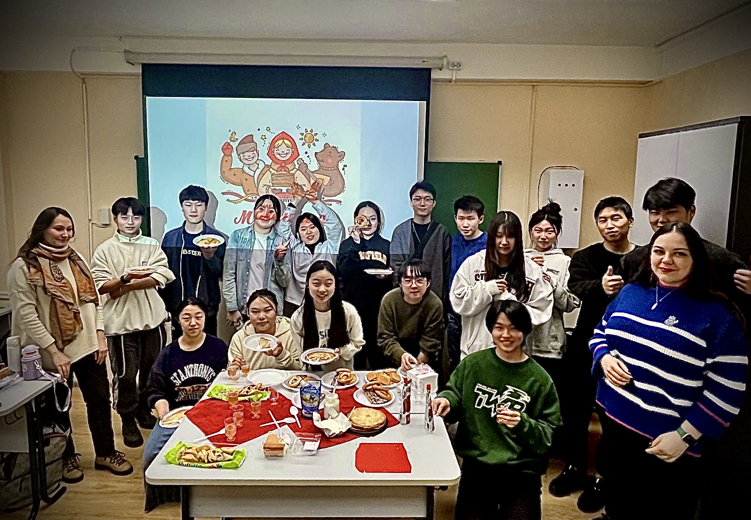 Преподаватели М.В. Басова и Е.Д. Брызгалина провели занятие по русскому языку для иностранных студентов первого курса, посвящённое изучению традиций празднования Масленицы.