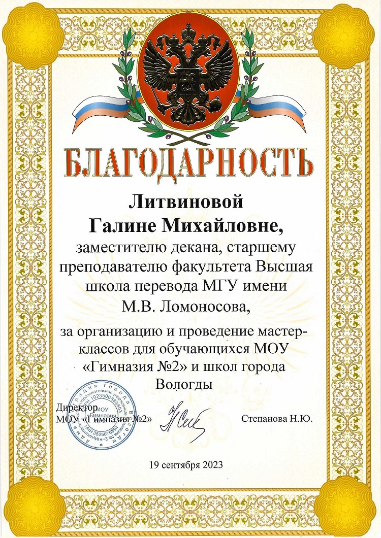 18 и 19 сентября 2023 г. преподаватели Высшей школы перевода (факультета) Московского государственного университета имени М.В. Ломоносова в рамках проекта «МГУ – школе» провели встречи с учащимися и преподавателями средних общеобразовательных школ, гимназий и лицеев Череповца и Вологды.