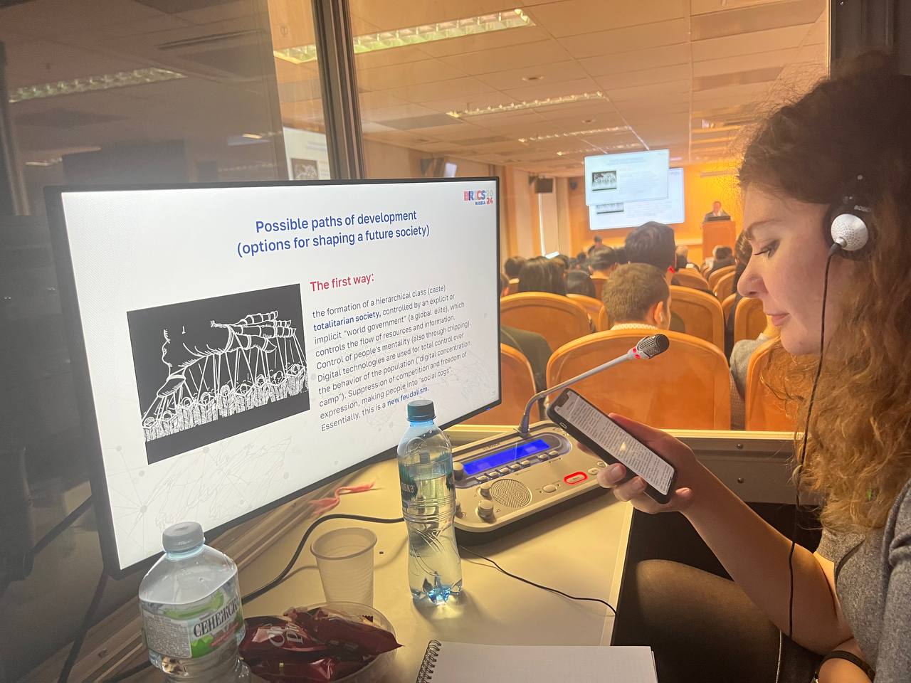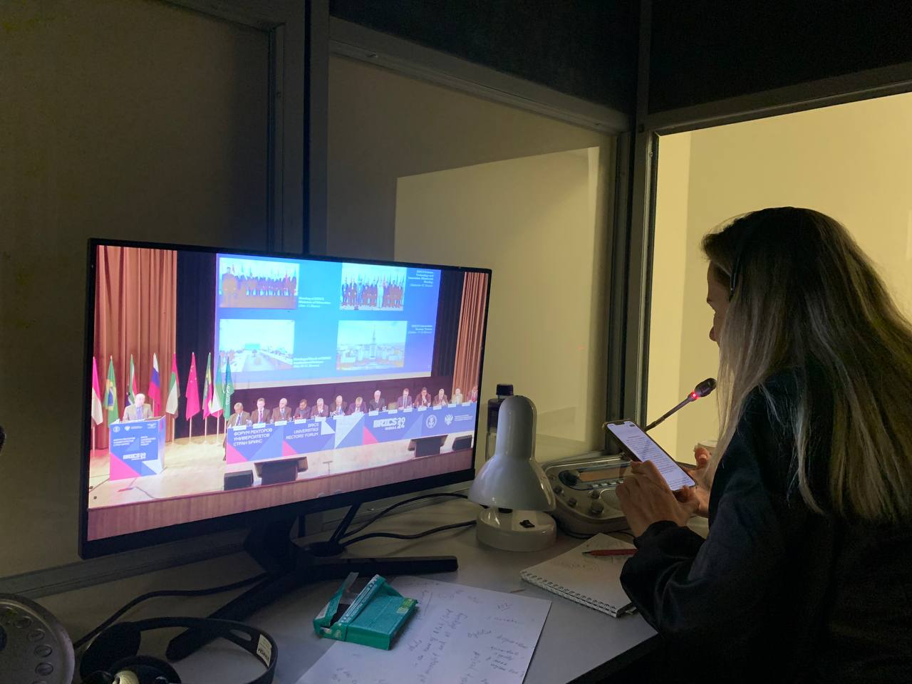 Столь масштабное международное мероприятие не могло бы состояться без качественной лингвистической поддержки. 17 октября преподаватели-синхронисты Высшей школы перевода Шебаршина Дарья Юрьевна и Серикова Анастасия Владимировна осуществляли синхронный перевод на пленарном заседании и пленарной сессии форума. За нашими коллегами была закреплена английская кабина. Многоязычный перевод – особая отличительная черта данного форума. Английский, португальский, арабский, фарси и китайский – все это рабочие языки форума, и это подчёркивает особую значимость устного синхронного перевода.