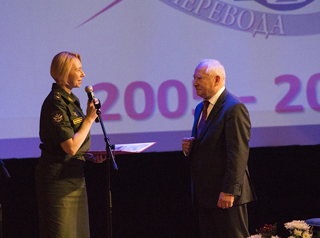 Также со сцены факультет поздравили коллеги из университетов, где ведется подготовка переводчиков: заместитель начальника Военного университета по научной работе генерал-майор доктор филологических наук профессор Князева Е. Г., а также делегация Московского государственного лингвистического университета во главе с деканом переводческого факультета доктором филологических наук доцентом Гусейновой И. А.