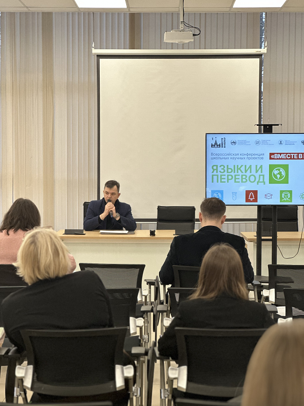 Программа первого дня открылась работой секции «Языки и перевод», организованной по инициативе Высшей школы перевода (факультета). С приветственным словом к участникам конференции обратился заместитель директора по учебной работе, к.ф.н., доцент кафедры теории и методологии перевода Ушаков С.Г. Он рассказал о вызовах, с которыми сталкивается современный переводчик, о проблемах взаимодействия человека с искусственным интеллектом, а также о перспективах работы переводчика.