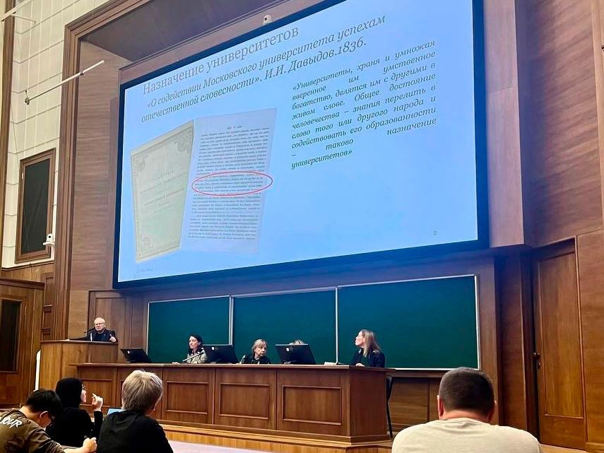 Доклад «От черновика Ломоносова до «красной книги»: перипетии теории», представленный доцентом, кандидатом филологических наук О.И. Костиковой, был посвящён истории развития теории перевода в Московском университете. В выступлении были освещены ключевые этапы становления переводческой науки, начиная с филологических разысканий М.В. Ломоносова до современных исследований. Особое внимание было уделено фундаментальному труду «Теория перевода» Н.К. Гарбовского, заложившему в 2004 году вектор целому ряду исследований по теории, истории и методологии перевода и ставшему отправной точкой при создании научной школы «Трансдисциплинарная наука о переводе». За 20 лет книга выдержала более 10 переизданий и выпусков, в 2024 году она переиздана в серии «Классический университетский учебник» в рамках издательской программы, посвященной 270-летию Московского университета.