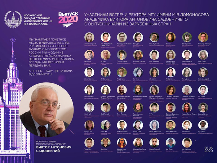 25 июня состоялась традиционная встреча ректора Московского университета, академика Виктора Садовничего с выдающимися выпускниками МГУ 2020 года – гражданами зарубежных стран.